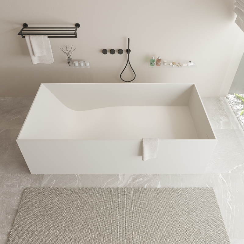 Solid Surface is een composietmateriaal dat 60% Aluminiumtrihydraten (ATH) bevat en 38% harsen. De rest zijn Katalysatoren, Verharders, Pigmenten en MMA. Door deze technische samenstelling zijn de Fonteinen, Baden, Wastafels en Opzetkommen van Ideavit voorzien van diverse exclusieve kenmerken. Het is uiterst duurzaam, Uv-bestendig en niet-toxisch. daarbij zeer homogeen, compact en niet poreus materiaal dat heel makkelijk te onderhouden is. Wees voorzichtig met te hoge temperaturen. Dit kan een Thermoshock veroorzaken met hierdoor schade aan het product. Het schoonmaken van het Ideavit Solidstar 180 vrijstaand bad is makkelijk, gewoon een doekje met milde zeep. De wat hardnekkige vervuiling met een schuursponsje.