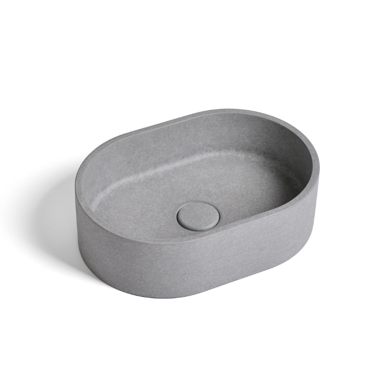 Solid Surfaces onthult de Ideavit IDEA ROCK-B1 betonnen vrijstaande wastafel met een uniek ovaal design. Met zijn afmetingen van 40 cm lang, 28 cm breed en 12 cm hoog, in betonkleur B1, brengt deze wastafel industrieel chic naar uw badkamer. De wastafel heeft een anti-kras afwerking en een waterdichte coating, inclusief een pop-up afvoer met betonnen afdekplaat. Deze opzet wastafel is bij uitstek geschikt voor een RVS 316L inbouw wastafelkraan, in de muur of eventueel in het blad waar de wastafel op staat.