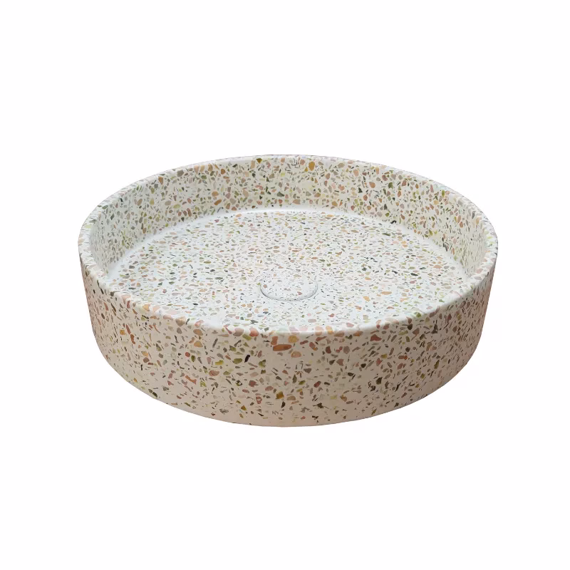 Solid Surfaces presenteert de Ideavit IDEA SMART-E13 terrazzo vrijstaande waskom die een tijdloze elegantie naar uw badkamer brengt. Met een diameter van 42,5 cm en een hoogte van 10 cm, in de terrazzo kleurvariant E13, biedt deze waskom een uniek designelement. Compleet met een pop-up afvoer en een terrazzo afdekplaat, een anti-kras afwerking en een waterdichte coating, combineert de IDEA.SMART-E13 esthetische schoonheid met functionele voordelen, waardoor het een ideale keuze is voor elke moderne badkamer. Jouw badkamer verdient alleen het allerbeste! De prachtige terrazzo collectie van Ideavit is een meesterlijke creatie, gemaakt met zorg en precisie.