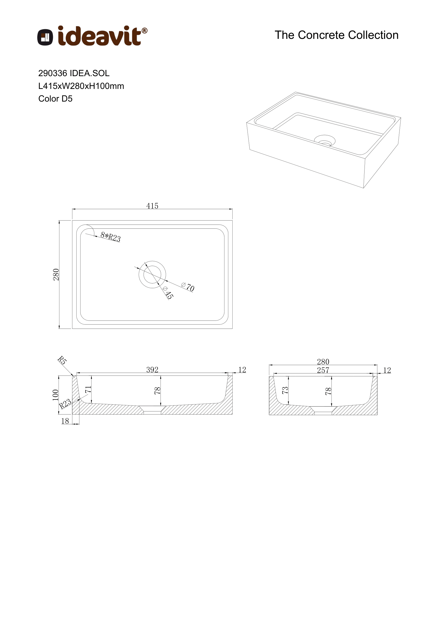De Ideavit IDEA SOL-D5 betonnen vrijstaande wastafel, aangeboden door Solid Surfaces is een statement van modern design en functionaliteit. Deze rechthoekige wastafel in betonkleur D5 heeft royale afmetingen van 41,5 cm lengte, 28 cm breedte en 10 cm hoogte. Met ronde binnenhoeken en een anti-kras afwerking, is deze wastafel duurzaam en stijlvol, zeker in combinatie met een RVS 316L inbouw wastafelkraan! Inclusief een pop-up afvoer met betonnen afdekplaat in de zelfde D5 kleur en een waterdichte Nano coating voor langdurige schoonheid.